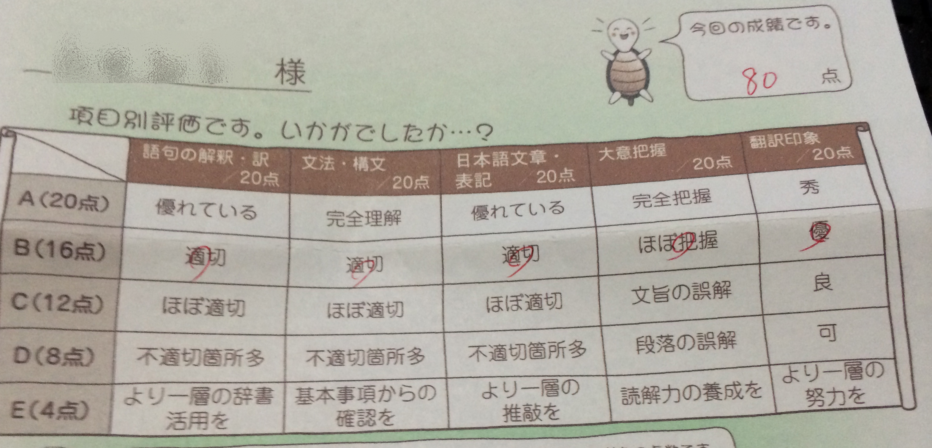 日常/心 翻訳入門講座の第一回添削が返ってきました 2013年9月30日 / 翻訳入門講座の第一回添削結果が返ってきました。 1回目はそこそこわかるものが多かったせいか、割といい点数だったようです。 講評では、 『少し勘違いされてしまった箇所はありましたが、全体的に安定した良好な訳に仕上がっています』 と、書かれていました。 テキスト2冊目になった途端、かなり難しくなりましたが、2回目の添削も頑張ろうと思います。