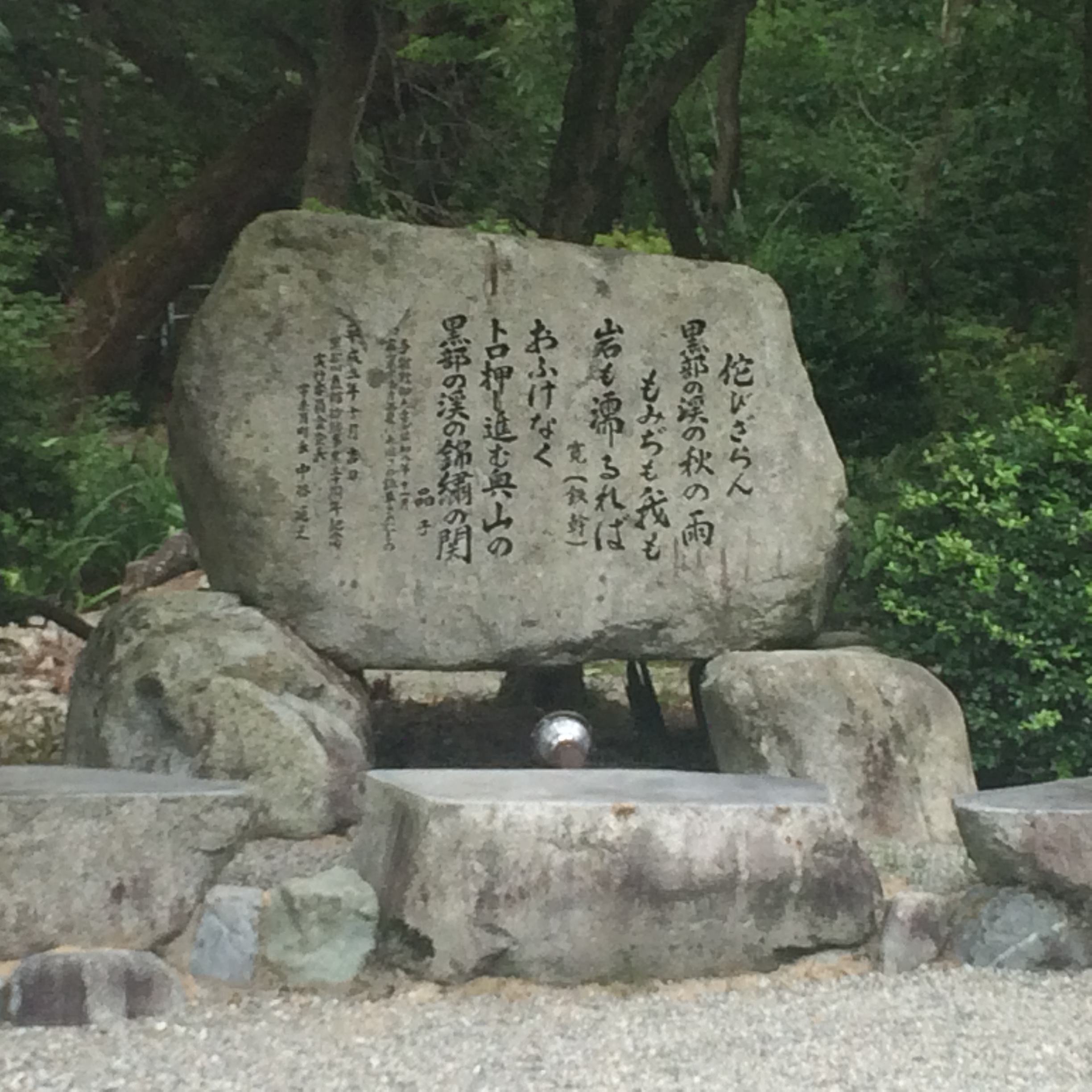 朝時間がなくて、与謝野晶子の歌碑が見られなかったという話をしていたら、通りがけに「あそこに見えるのがそれだよ」と教えて貰いました。奥には昭和天皇の記念碑も。(遠くて撮れませんでした)