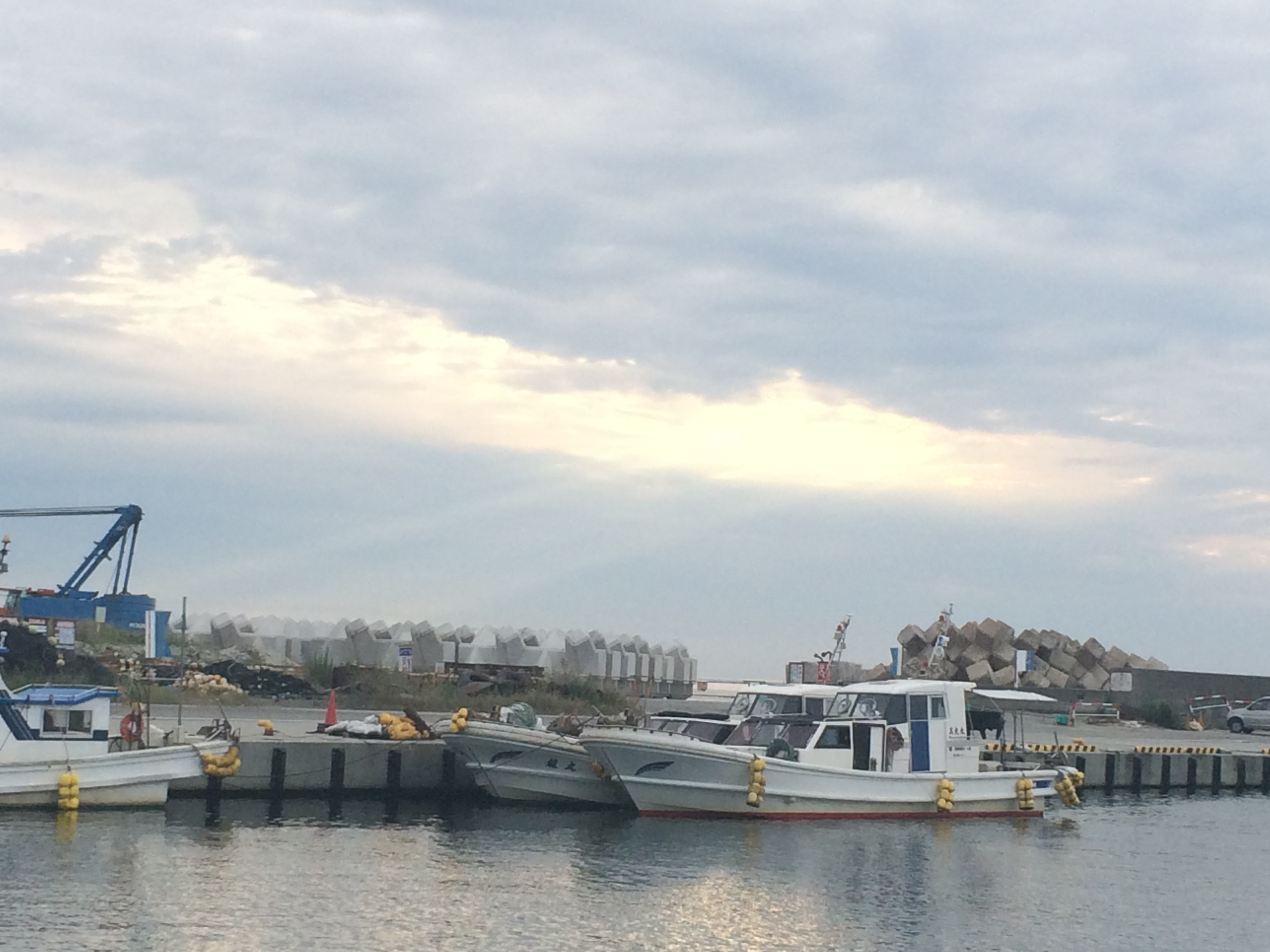 さて、宇奈月温泉を発っていよいよ、旦那の実家へ。少し休んでから海へ散歩に出たところ、空にとても綺麗な光の筋がでていることに気づきました。