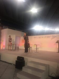 まずは今日の服装について。花をあしらった上着なのですが、「本当は着物を着てこようかと思ったんですけれど、あまり女性らしいのも合わないかと思って」と。司会者のお願いで一回転しましたが、背中にも花が刺繍されていました。写真で立ってるのは最後のご挨拶のときのだけですが、相変わらずの足の長さ・スタイルの良さでした。