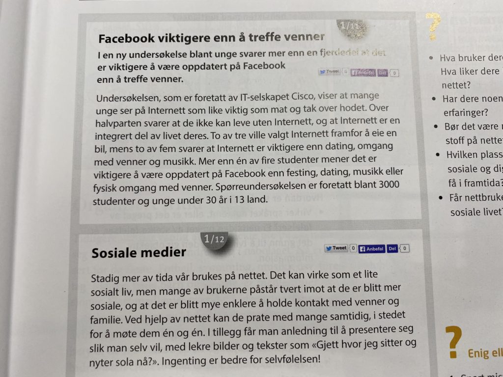 CDの中身も大きく変わりました。以前は生徒用と教師用にわかれていたのですが、今回は「教科書用」と「ワークブック用」にわかれています。そして、以前と異なり教科書の殆どに音源が用意されているようです。1章を終えたところですが、1章で音源がなかったのは、章の序文とチラシの写真の部分と「プロフィール」として著名人の紹介を書いていた部分だけでした。ちなみに、「プロフィール」のほうは、『Her På Berget』の無料課題サイト(簡単なクイズ形式になっている)のほうに掲載されていました。
