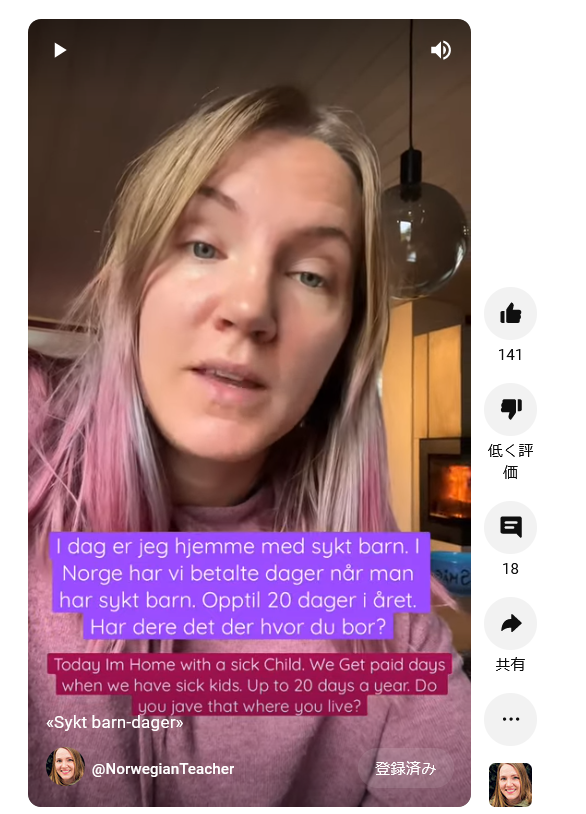 この”I Norge har vi betalte dager “のところです。内容から病気の子供を看護するための有給休暇が、ノルウエーでは年に20日まで取れることがわかります。でも、「あれ?」と思ったのは「har betalte dager」のところです。dagerは、dag(日)の複数形だから良いとして、betaleは支払うという単語。betalteは、「betale」の過去形(支払った)です。harのところがfår ならわかります。その場合はfår betalt dager(日を支払って貰った)として、文脈からは休みを貰ったとなりそうなので。でも、ここは「har(持つ)」。