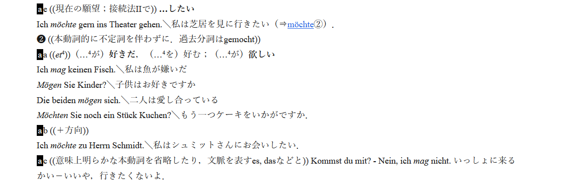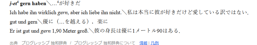 この通り。ちなみに、gernは副詞だそうです。「~したい」の例文では「好き」で出てきた単語と一緒に使って『~したい』になってますね。どんなときに動詞+gernを使い、どんなときにmegを使うのか…。まだイマイチよくわかりません。