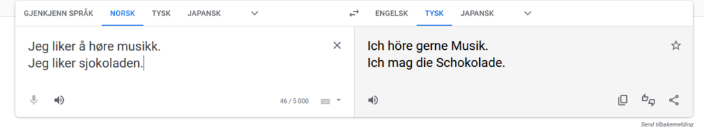 これは、左がノルウェー語で「私は音楽を聴くのが好きです」と「チョコレートが好きです」。そして右がドイツ語です。1行目ではgerneが「好き」。2行目ではmagが「好き」。辞書でmagを調べるとmögenが出てきて、