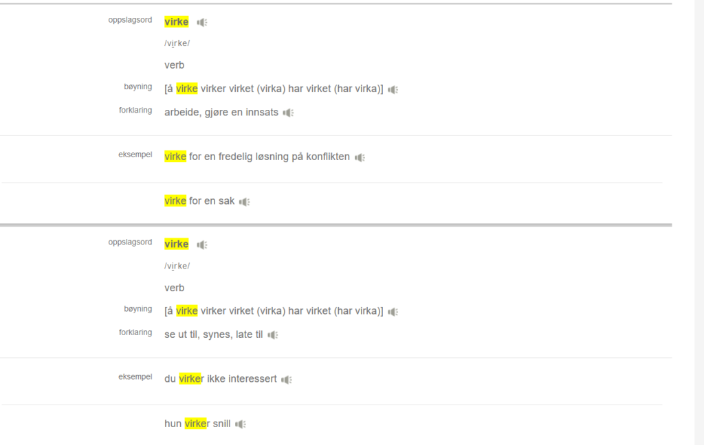ノル語レッスンでは作文も見て貰っています。その時に、数ヶ月前の大阪旅行へ行ったときの東京と大阪で真逆の出来事があり、それを作文したのですがそこで出てきたのがvirkeでした。その出来事というのは、東京から大阪に向かうときなかなか搭乗が始まらず、5分前に漸く自分も搭乗できる状態でこちらが焦るというか…そんな感じだったのですが、帰り………つまり、大阪から東京に向かうときは30分前くらいには搭乗が始まり(放送も流れていた)、5分前には当然のように全員着席で動き出し、文字通り「定刻に離陸」したのでした。当然、動いているCAの方々の様子が同じ30分前でも全然違っていたのです。