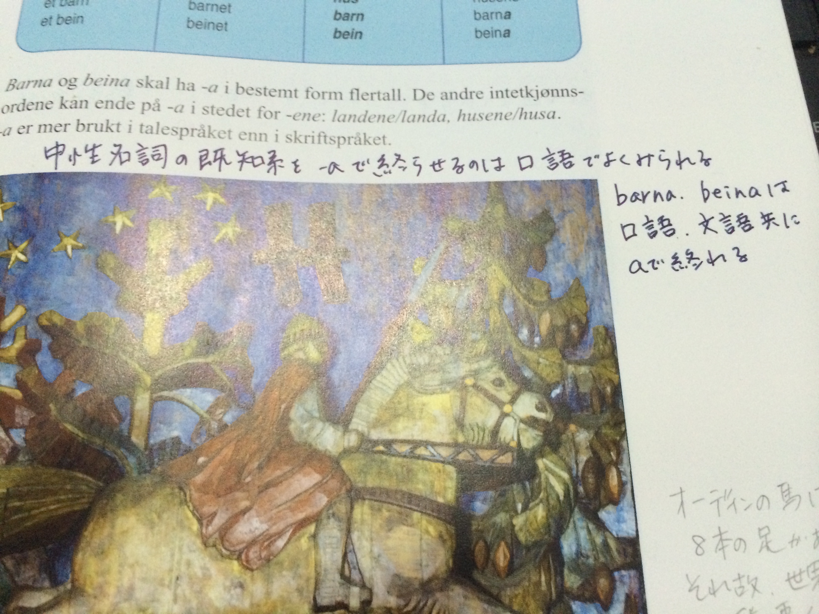 たとえば、中性名詞の複数形(既知形)も、aで終わるのはbarna(その子供達), beina(骨・複数形)で、他はhusene(その家々)などeneで終わるのだけれど、『口語では「husa」のようにaで終わらせることが多い』とありました。